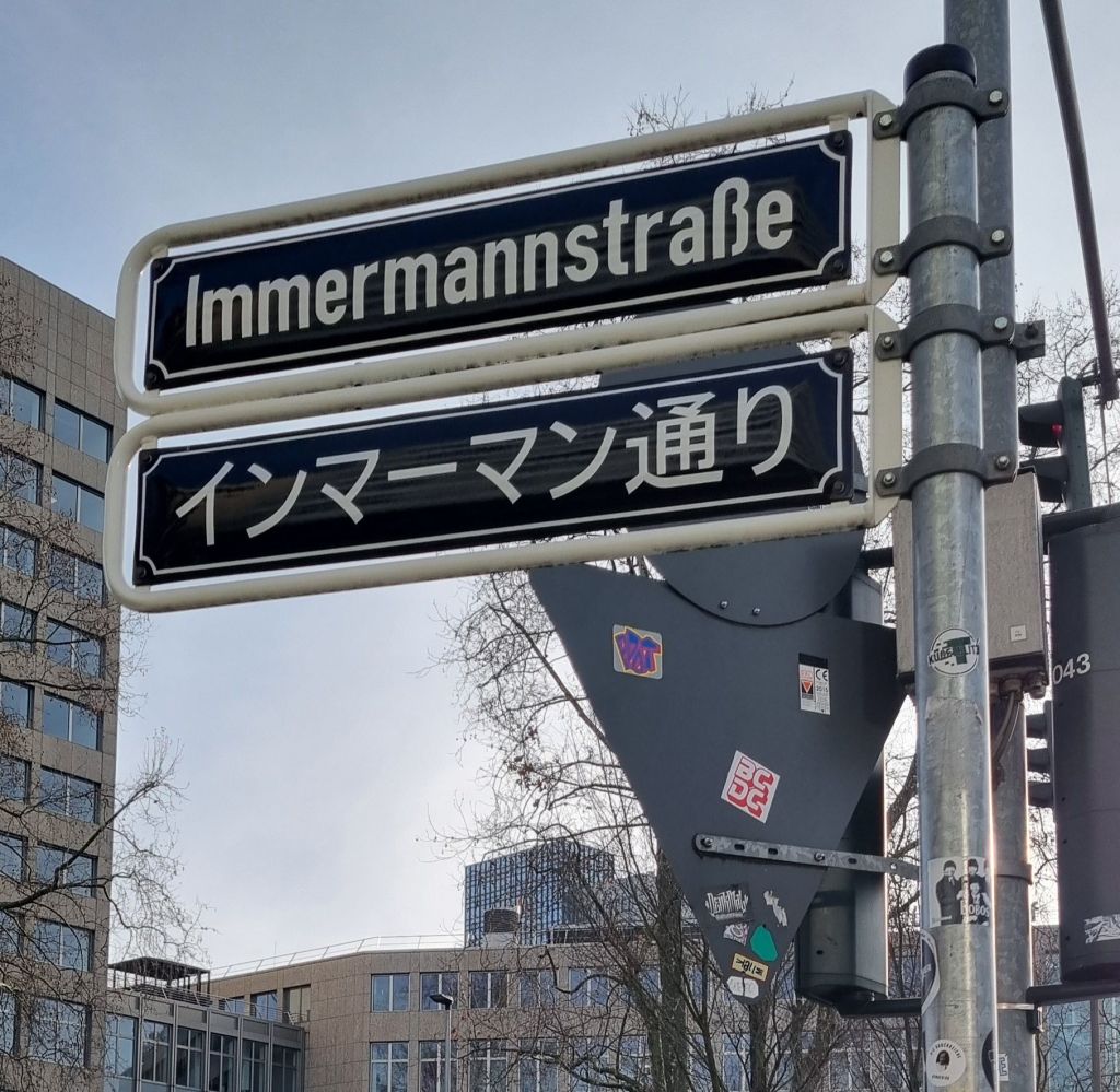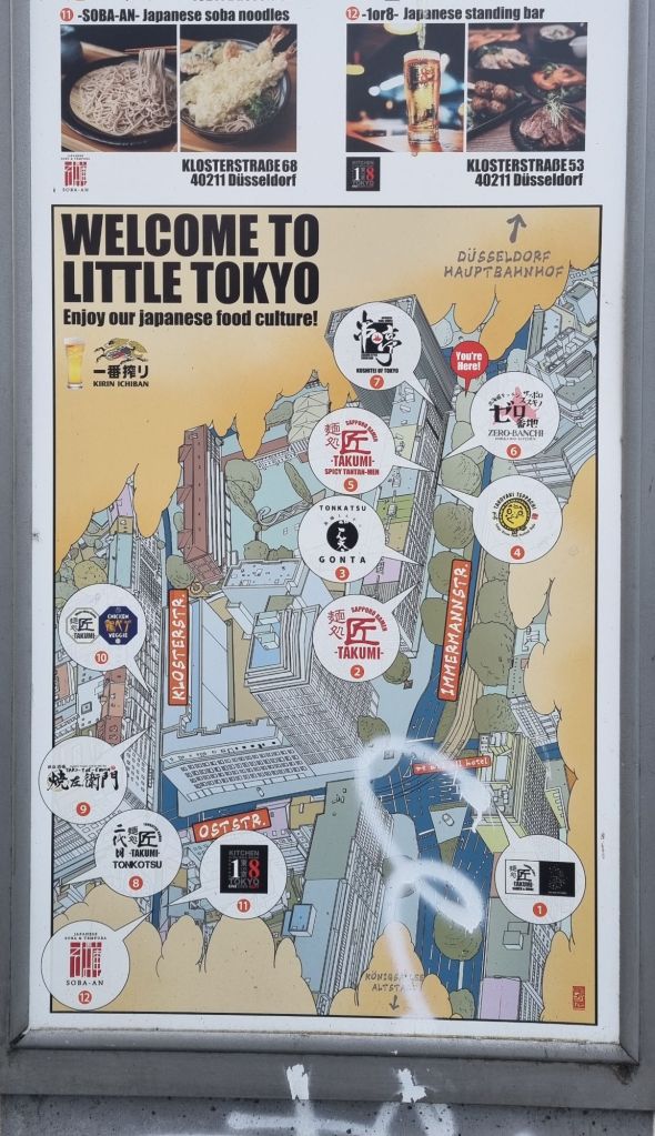 Wij logeren hier in Düsseldorf in een wijk die “Little Tokyo” wordt genoemd. Veel grote steden, overal ter wereld hebben een Chinatown, hier in Düsseldorf is het juist een wijk met een hoge concentratie Japanse winkels en restaurants. Inmiddels hebben wij gemerkt dat veel Japanse toeristen dat aantrekkelijk vinden en hier in deze wijk hun verblijf boeken. De liefde voor Japan gaat zelfs zo ver dat een aantal straatnamen niet alleen in het Duits, maar ook in het Japans worden aangegeven.