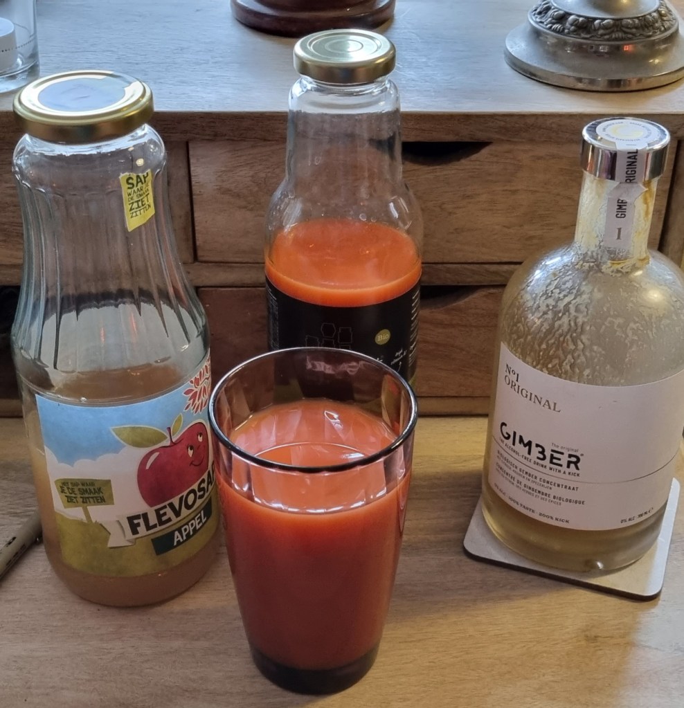 49% wortelsap en 49% appelsap, beiden niet uit concentraat, met 2% Gimber. Een (W)ortel(AP)pelsap(PIE). Probeer het maar eens, kijk wel uit want deze mocktail kan verslavend zijn.