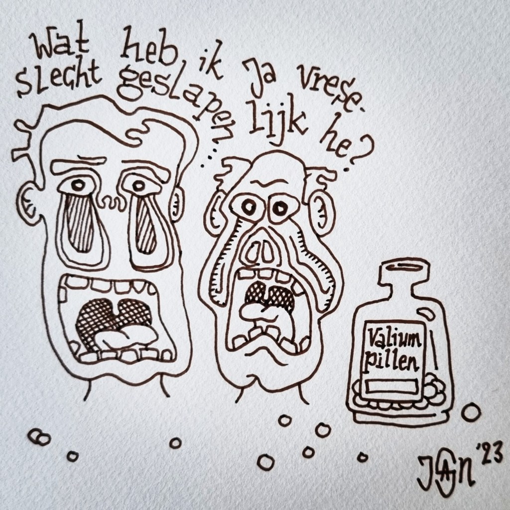 Met een ferme knal plantte hij zijn jeneverglas terug op de tap. “Doe er nog moar ene” bromde hij naar den waard. “Zou je dat nou wel doen?” vroeg deze terwijl hij de dop al van de fles aan het schroeven was. “Het goat wel” mompelde hij terug. Zwijgend keken ze hoe de drank langzaam de rand van het glas bereikte. Er werd geen druppel gemorst en geen woord gesproken. Hij zuchtte nog eens, pakte het glas en klokte de inhoud in een keer achterover. “Zo, dan ga ik moar”. Hij pakte zijn pet, gleed van de barkruk en waggelde naar de deur. De twee overgebleven stamgasten en den waard keken hem met enig medeleven na. Toen de deur was dichtgevallen waren ze het snel met elkaar eens. Als zij naar de operetteuitvoering van hun schoonzus moesten hadden ze er minstens nog een genomen.