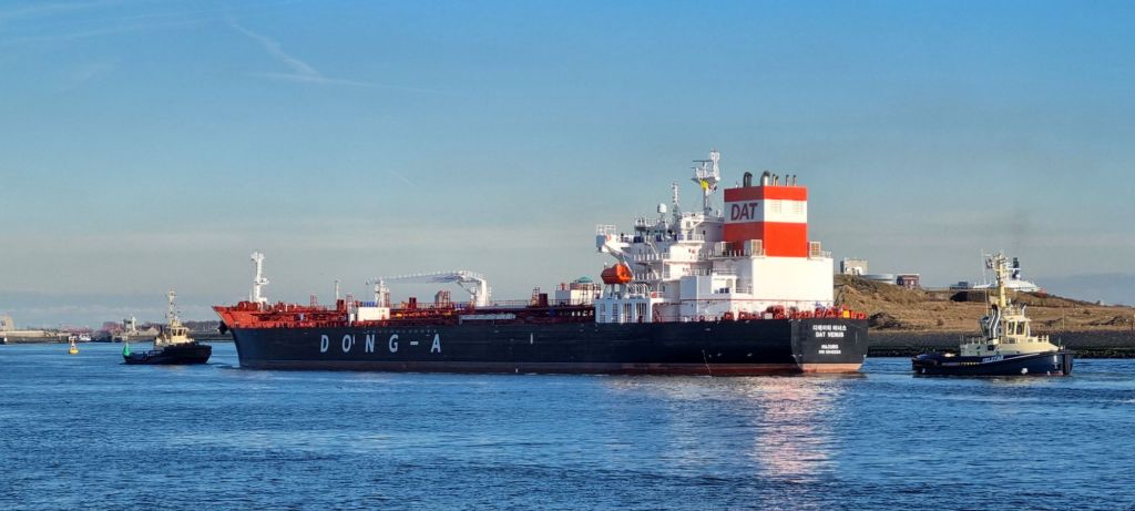 Het is de schuld van Karel. Want die begon hier vandaag over mooi weer. Dus zijn we maar even naar de pier gereden om de DONG-A binnen te zien lopen. Vanwege dat mooie weer. Mocht je hier wat over te zeuren hebben moet je dus bij Karel zijn en niet hier op de vluchtstrook.