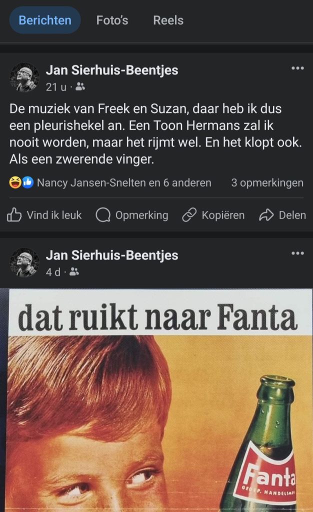 Daar is dus werkelijk niets an. Ik doe het momenteel beter op Facebook dan hier. Dat is natuurlijk een zorgelijke ontwikkeling. Zeker als ik bij Bas lees dat hij denkt dat ik het heb opgegeven. Daar gaan we dus even verandering in brengen, we leven uiteindelijk alweer een paar dagen in maart. En het is lente. Ook voor Freek en Suzan. Sjeune patie, patie, patie! Sjeune patie, patie! Mijn God wat een zeiknummer.