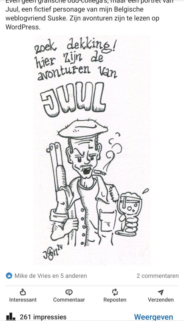 Sinds vanochtend is Juul 261 keer bekeken op mijn LinkedIn account. Ik vraag mij af of hij een beetje overeenkomt met het idee van zijn personage? Volgens mij is mijn email niet helemaal goed aangekomen in Roeselare. In ieder geval, de geestelijke vader van Juul mag hier uiteraard gebruik van maken š hieronder de tekening nog een keer zonder screenshot-rommel.