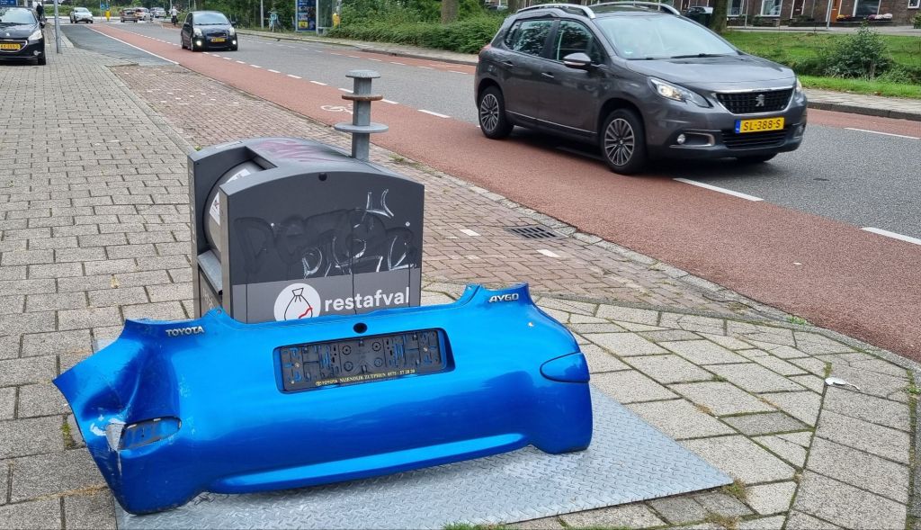 Ondertussen, heeft iemand in Heemskerk de halve achterkant van zijn Toyoto Aygo bij het restafval gezet. Daar is de oudijzer handelaar het vast niet mee eens…