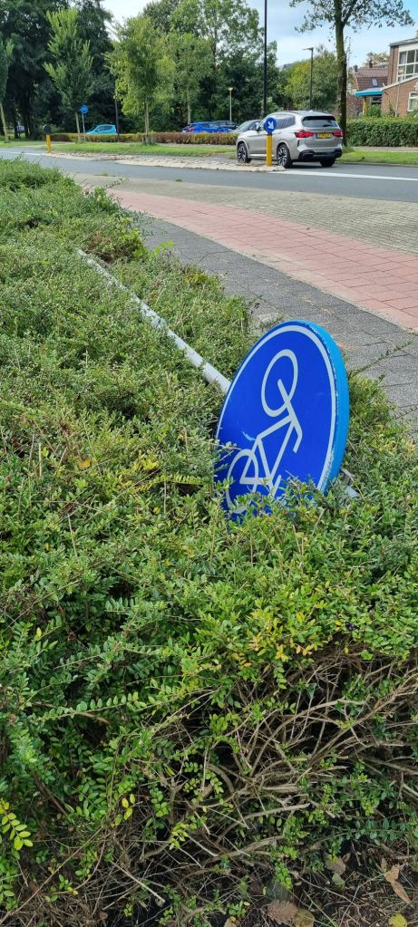 Ondertussen dacht iemand in Beverwijk bij zichzelf “als we al die gestorven paraplu’s in het plantsoen flikkeren kan dat bordje van mij er ook nog wel bij” en hopla, gelijk heeft ie, je kan er maar vanaf zijn.