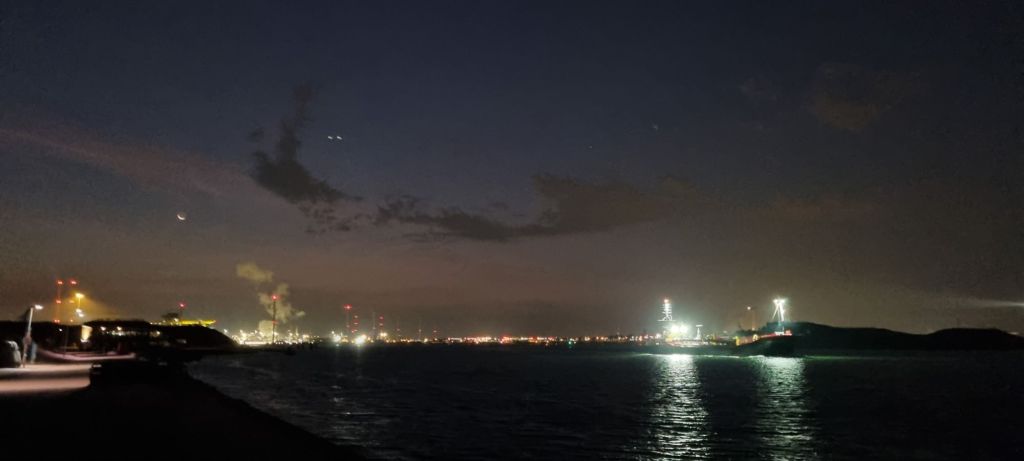 Er stond een auto met de koplampen aan en twee personen er in. Ik heb maar niet door het raampje gekeken wat die aan het doen waren en ben doorgelopen. Er stond een auto met de lampen uit, ook met inhoud, wederom genegeerd. Op de pier zelf zag ik drie man verscholen in hoody’s met zaklantarens iets zoeken tussen de betonblokken langs de pier. Drugs? Illegale visfuiken? Ik ben maar niet blijven staan om te vragen wat ze aan het zoeken waren. Aan het eind van de pier kwam ik uiteindelijk de gebruikelijke zwijgzame vissers tegen. Op wat voor tijdstip je er ook komt, volgens mij zie je ze daar altijd wel.