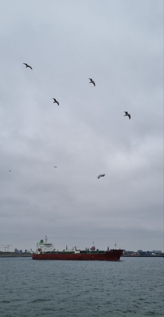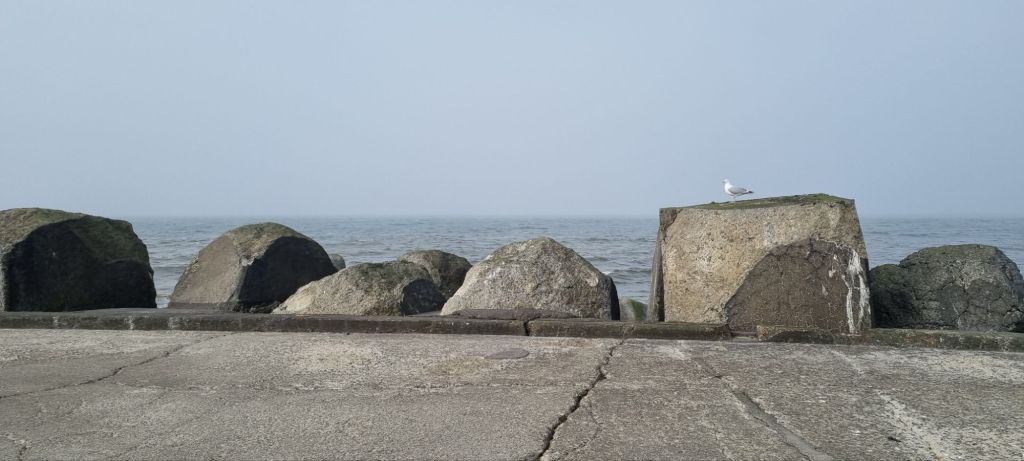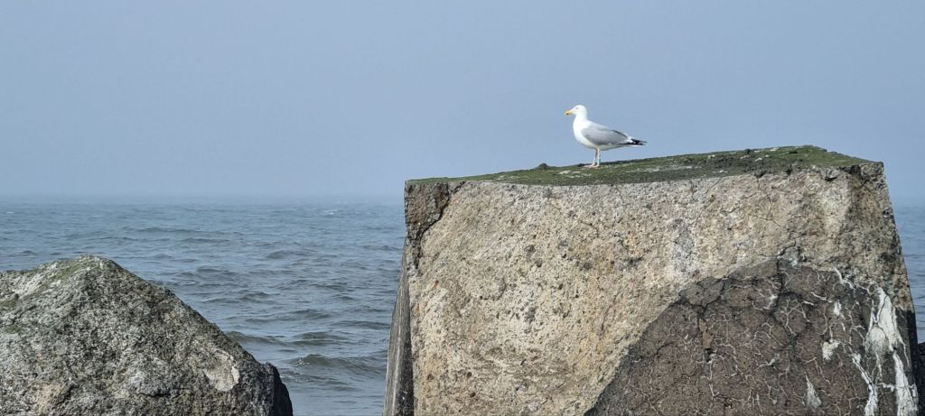 Ik liep vanochtend alleen op het uiteinde van de pier. Totdat ik gezelschap kreeg. Met zijn platte poten landde deze meeuw op een betonblok in de buurt. Hij snauwde mij een paar keer “Ihjajajaja” toe. Ik mocht een foto maken. Aangezien ik niet te beroerd ben om een beetje te praten met het leven op aarde, ik neuzel bijvoorbeeld ook wel eens tegen een boom, gaf ik ‘m gelijk en zei “ja, ja, ja” terug. En daarmee had ik een beter gesprek met deze gevleugelde vriend dan ik veel mensen met elkaar op televisie zie hebben, tja, tja, tja…