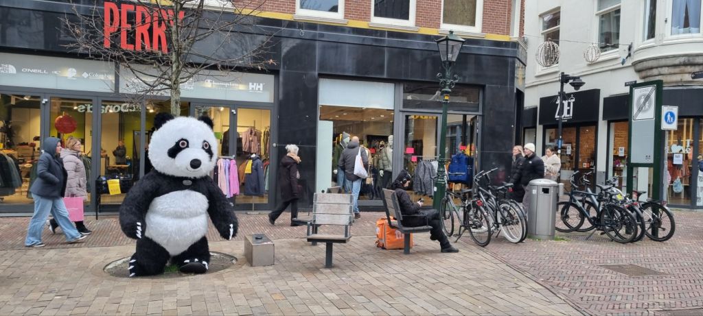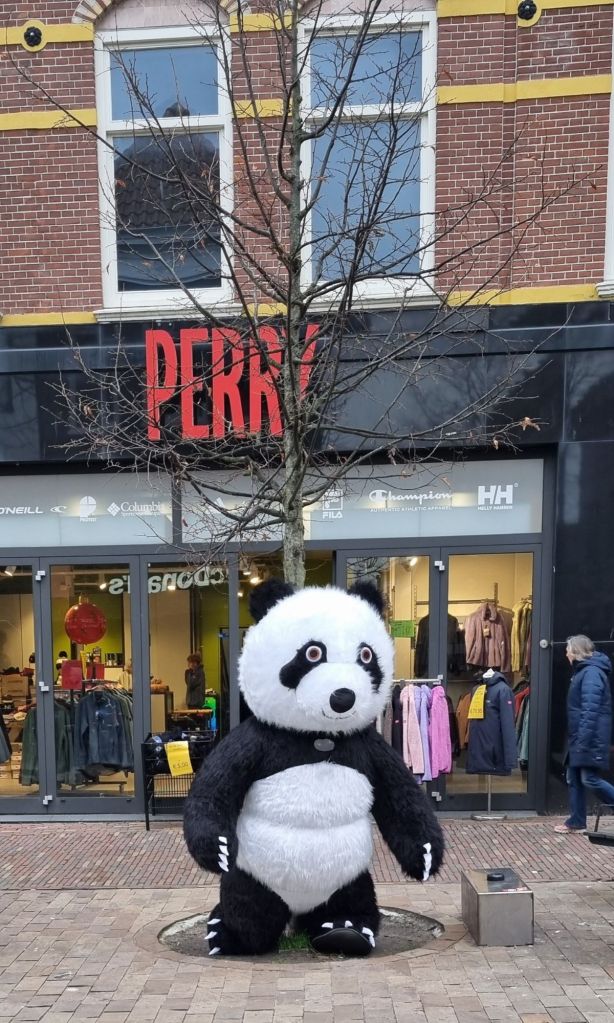 De kerstbomen worden al opgezet tussen de Sinterklaas etalages in Alkmaar. Dus zet Perry een grote opblaas-panda voor de deur. Dat is logisch? 😂