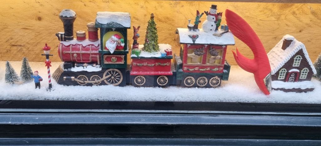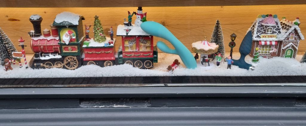 Alkmaar heeft een speelgoedwinkel voor volwassenen, met een apart kerstdorp in de etalage. Eerlijk is eerlijk, die buttplug rechts heeft wel iets van een kerstboom, maar ik zie die lichtblauwe wagon niet echt meerijden…