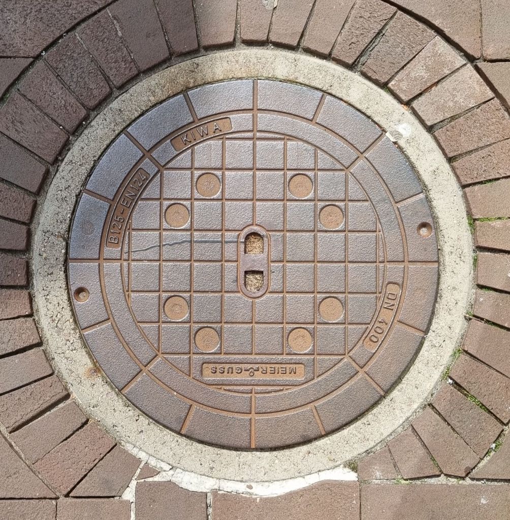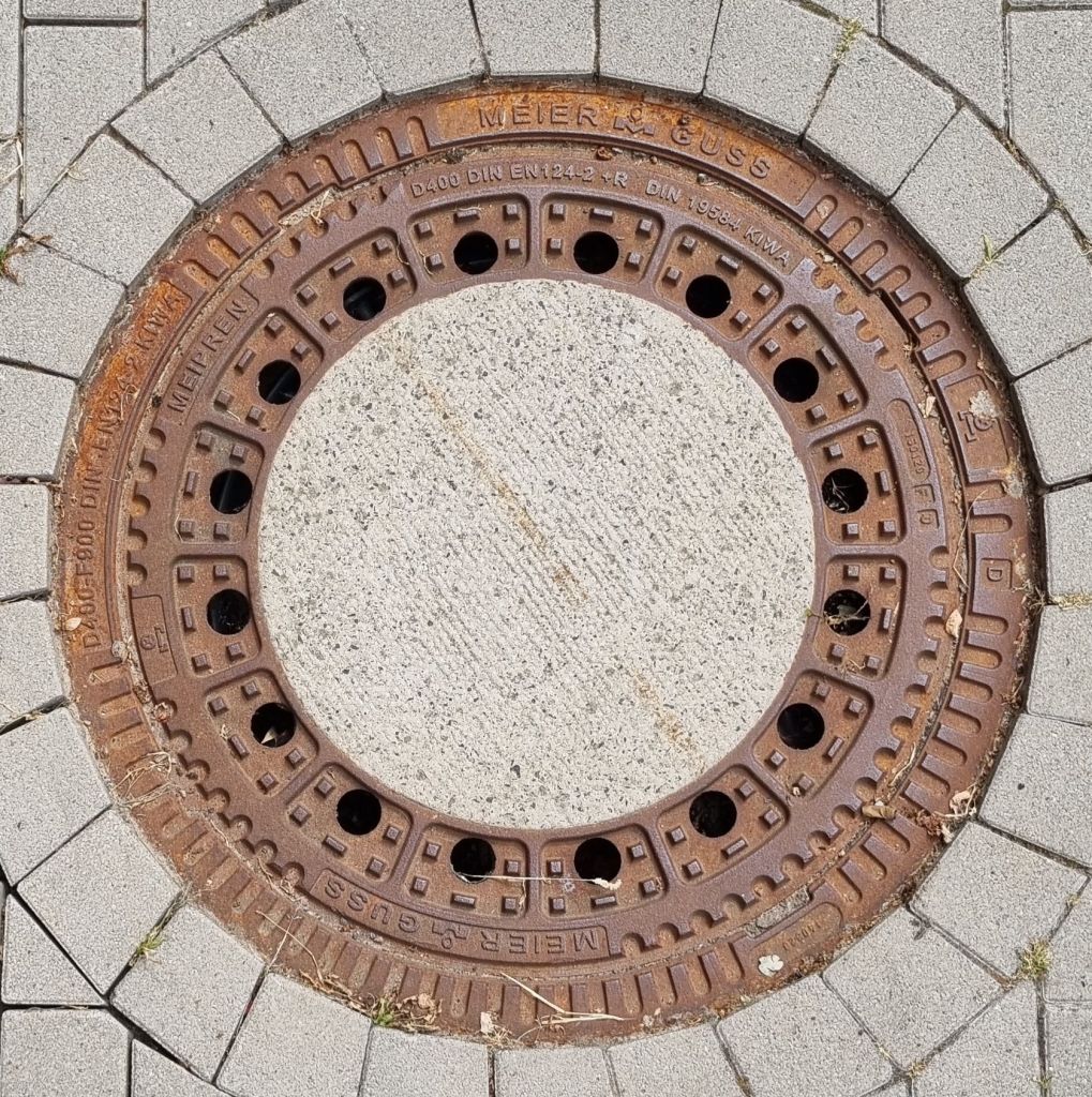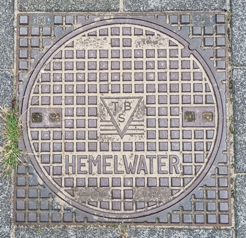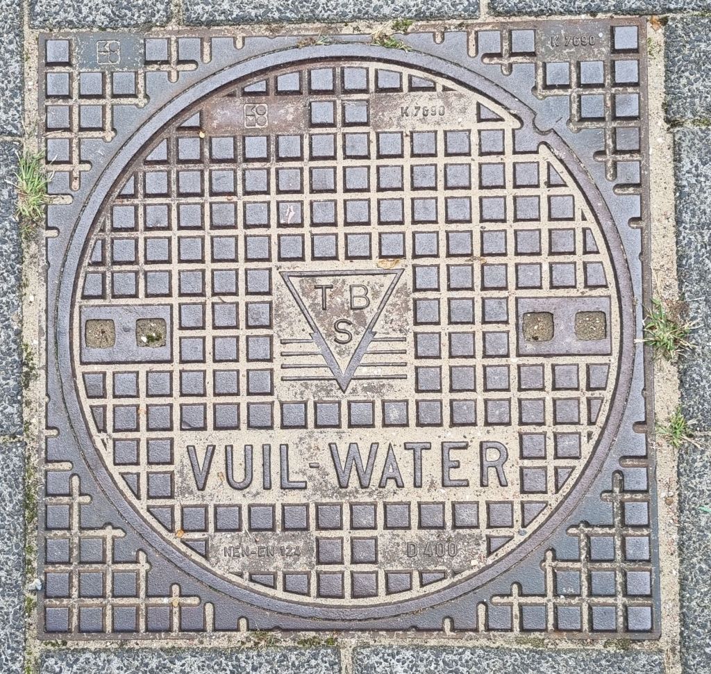 In Schiedam. Die voeten zijn van Em zelf, ik had ze eraf kunnen halen maar daar had ik geen zin in. Kunnen jullie allemaal ook eens zien wat voor schoenen hij aan heeft. Bovendien, het is ook helemaal niet aardig om iemands voeten eraf te halen, die moet je er aan laten zitten. Evengoed, het gaat natuurlijk om de putdeksel, waarvoor dank.