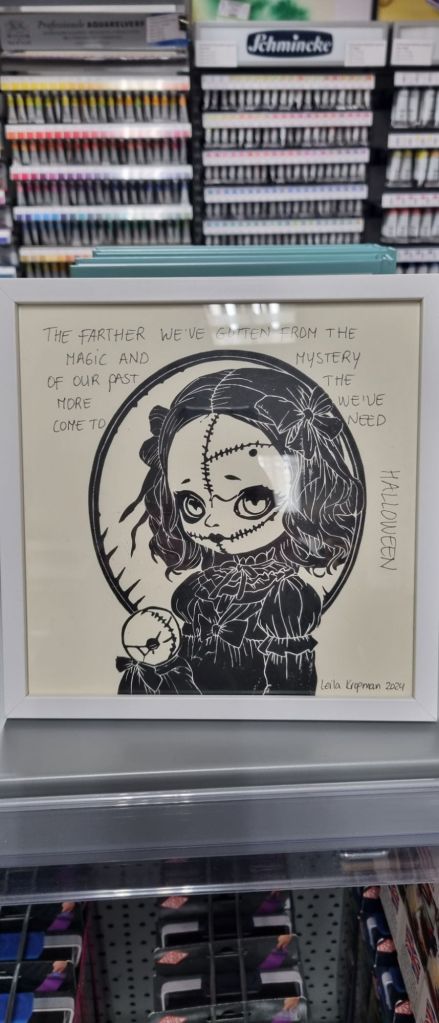 Ik liep tegen dat effect aan toen ik gisterochtend Art and Crafts in De Goorn een bezoek bracht en tegen deze linoafdruk van Leila Kropman tegen kwam. Ik ben zelf bezig met project voodoo-pop, waar ik later meer over zal posten, en nu lijkt het wel of ik ze overal tegenkom. Geen probleem mee, integendeel.