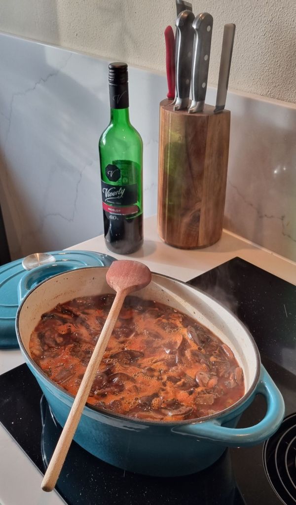 Ik heb een goed recept voor vegetarische paddenstoelenstoofpot. Een beetje bewerkelijk maar wel lekker. Die stoof is het lekkerste met portobello’s. Ik heb wel eens kastanjechampions geprobeerd maar dat is het toch niet helemaal. Nou is het alleen een beetje lastig om vlak voor kerstmis aan portobello’s te komen, die dingen vliegen dan ineens de winkel uit. Dus ik heb slecht nieuws voor Heemskerk, ze zijn daar nu uitverkocht. Ik sta vanmiddag in de pan te roeren en haal eerste kerstdag mijn stoof uit de vriezer. Lekker gemakkelijk.