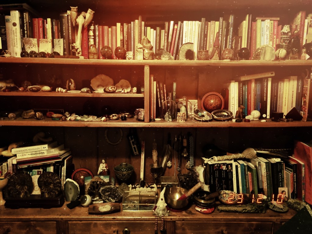 Toon mij uw boekenkast en ik vertel u wie u bent. Hierbij een stukje van mijn boekenkast. Nou ja, boekenkast, er ligt van alles in. Kristallen, klankschalen, een verdwaalde Jezus, uiltjes, pendels en natuurlijk de nodige boeken. Het gaat echter even om het filter. Ik ben wat filters aan het uit proberen om het nostalgische effect te bereiken. Deze foto komt inclusief digitale datum uit de app “1998 Cam”. In deze app kan je verschillende oude camera’s selecteren, om vervolgens met de effecten van die camera’s foto’s te maken. Leuk om mee te spelen. Het haalt het natuurlijk niet bij het echte werk zoals je bij Marjolein kan bekijken. Maar voor een amateur zoals ik die op zijn mobieltje is aangewezen kan je er best leuke dingen mee doen.
