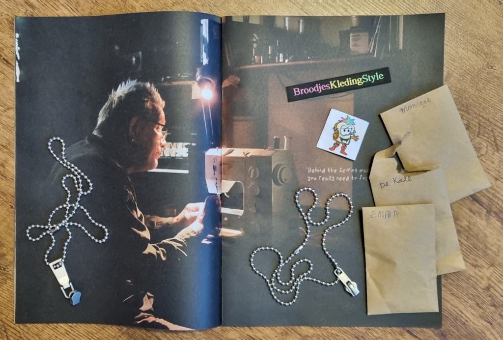 Vandaag lag er post van Broodje op de mat. Post in de vorm van een pretpakket. De labels voor BroodjesKledingStyle zijn heel mooi geworden. Ze hebben twaalf kleuren garen nodig gehad om het eindresultaat te bereiken. Als ik het goed heb begrepen voor de producent ook een heel leuke klus omdat het niet zo vaak voorkomt dat er zoveel kleuren garen in een label worden gebruikt. Werden we ook nog eens getracteerd op een BKS ketting en (heel leuk om te lezen) het magazine van the Makeover Factory, geheel gewijd aan het werk van Beppy Viergever aka Broodje.