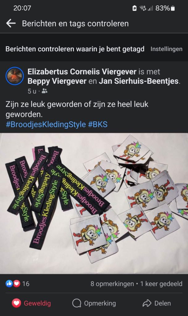 Ik had al een bericht ontvangen van Bep dat de kleding labels gemaakt waren. En net zag ik in mijn spaarzame Facebook-tijd de eerste foto van het resultaat. Postpakketje is naar ons onderweg. Altijd leuk om het resultaat van een ontwerp te zien. Meer aandacht hiervoor als de post binnen is.