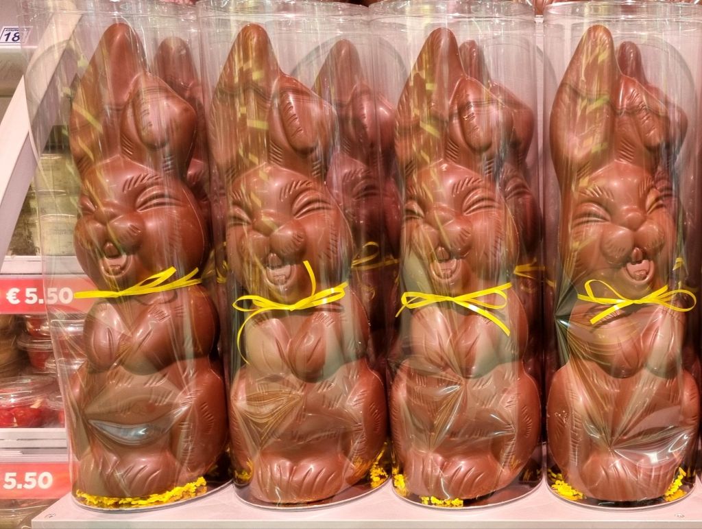 Ik weet het niet met deze hazen. Ze staan hier in de supermarkt met een gezichtsuitdrukking die weinig plezier uitstraalt. Hebben ze pijn? Nee, ze kijken eerder agressief, klaar om in de aanval te gaan. Of ze schreeuwen, maar ze zijn in ieder geval niet vrolijk. Neem daarbij het gegeven dat ze bijna een halve meter hoog zijn, volgens mij bezorgen ze kinderen slechte dromen. Ik zou ze zelf niet cadeau doen. Tenzij je een hekel hebt aan het desbetreffende kind. Dan is het natuurlijk een prima cadeau. Ze kosten alleen wel ruim zestien euro. En dat is dan weer veel voor een kind waar je een hekel aan hebt, zo’n volwassen prijs.