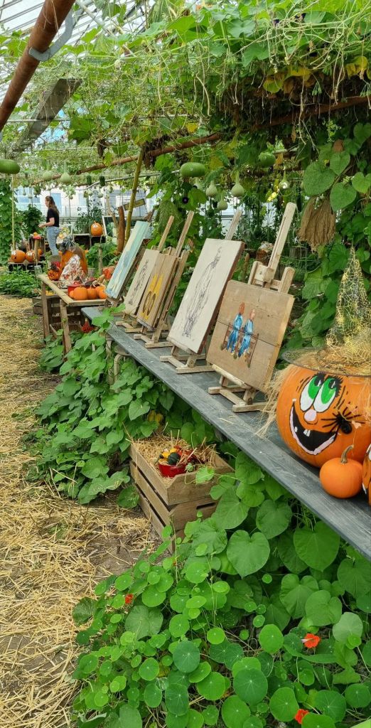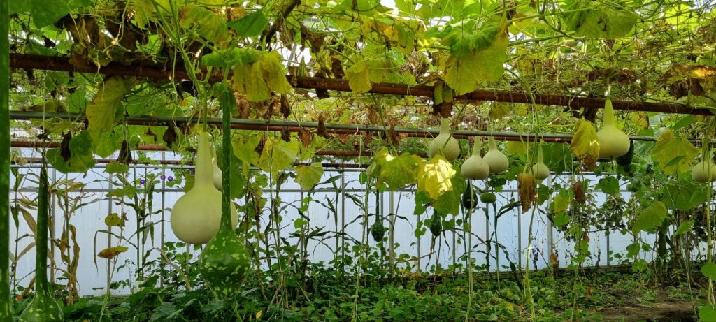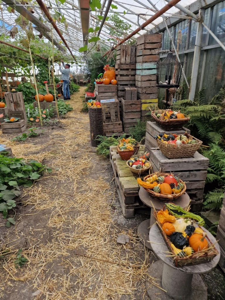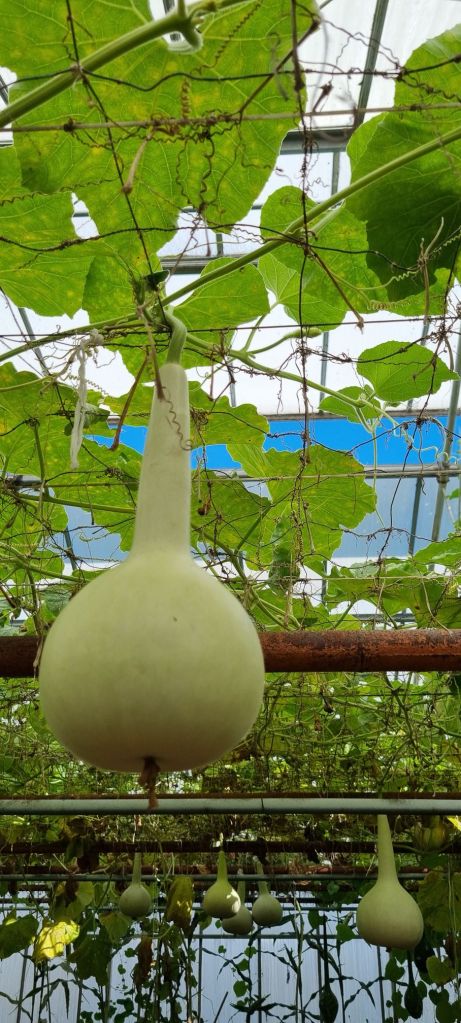 De pompoenen en kalebassen worden hangend gekweekt, dat voorkomt schade op de grond. Het was leuk om daar een hele kas vol mee te zien.