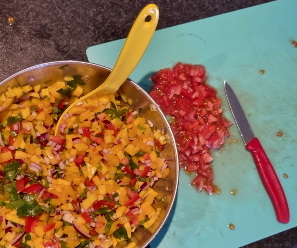 Chunky mango salsa, van die kleine dingen in het leven waar je dan weer vrolijk van wordt. Terwijl ik er mee bezig was stopte het met regenen (echt waar!).