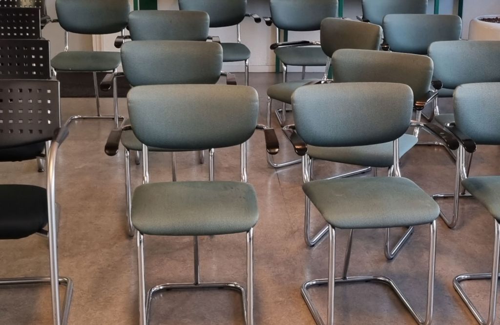 Lege stoelen in de kantine. Zo schrijf je hier een stukje over de Grafische Industrie, zo krijg je te horen dat de drukkerij waar je werkt failliet is. In deze stoelen zaten wij toen wij dit om 12:00 uur te horen kregen. Het kan verkeren. De komende tijd zal vreemd zijn. Even rustig de tijd nemen voor bezinning op de toekomst. Wat overigens niet betekent dat hier een pauzebordje op het weblog wordt gehangen. “The blog must go on” weetjewel. Wij lezen elkaar later.