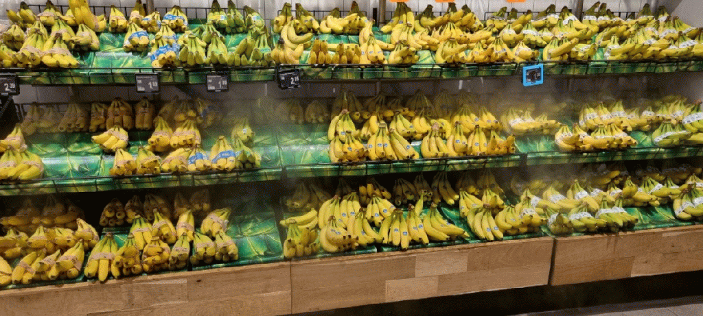 Iemand in de supermarkt dacht dat er bij mij een steekje los zat omdat ik de bananen op de foto nam. Dat had hij nog nooit gezien. Eens moet de eerste keer zijn, dacht ik bij mijzelf. Op mijn vraag waarom ze daar de bananen aan het benevelen waren had hij echter ook het antwoord niet. Alsof een natte banaan aantrekkelijker zou zijn dan een droge banaan?