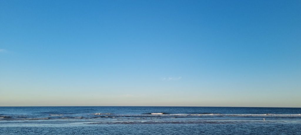 Het is heel rustig aan de kust. Er komt een klein beetje wind vanuit het land en het is bewolkt. De zee kabbelt richting de pier waar de grootste golfslag wordt veroorzaakt door de sporadische zeevaart.