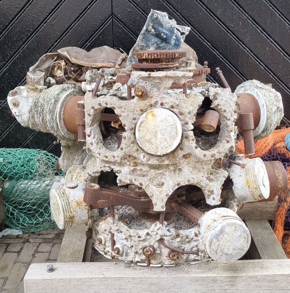 ter zee, en in de lucht. Maar bij dit motorblok van een vliegtuig ging het waarschijnlijk andersom, ter lucht, ter zee en op het land. Dit motorblok, of wat er van over is ligt in het juttersgedeelte van Kaap Skil. Op de foto gezet omdat ik er een gezicht in zie. Ik zal het resultaat in inkt op papier later met u delen beste lezer.