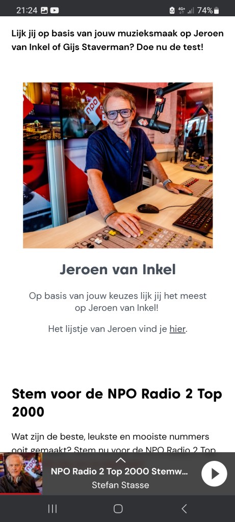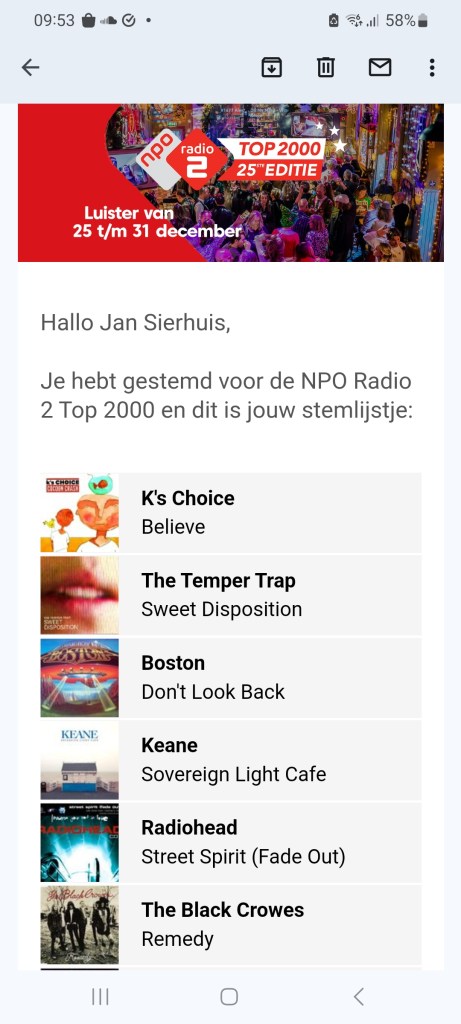 Als ik dan zie wat er van die muzikanten aan nummers in de lijst staan en wat het niet haalt van anderen denk ik bij mijzelf “laat maar”. Ik zit niet te wachten op vijftien keer Freek en Suzan. Dit draait voor een heel groot gedeelte niet meer om de muziek “an sich” en laat ik voortaan aan mij voorbij gaan. Ik wens andere luisteraars er veel plezier mee en ga naar het alternatief voor de Top2000 op Veronica luisteren! Fijne donderdag!