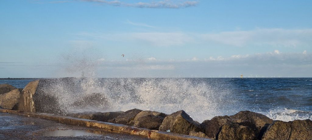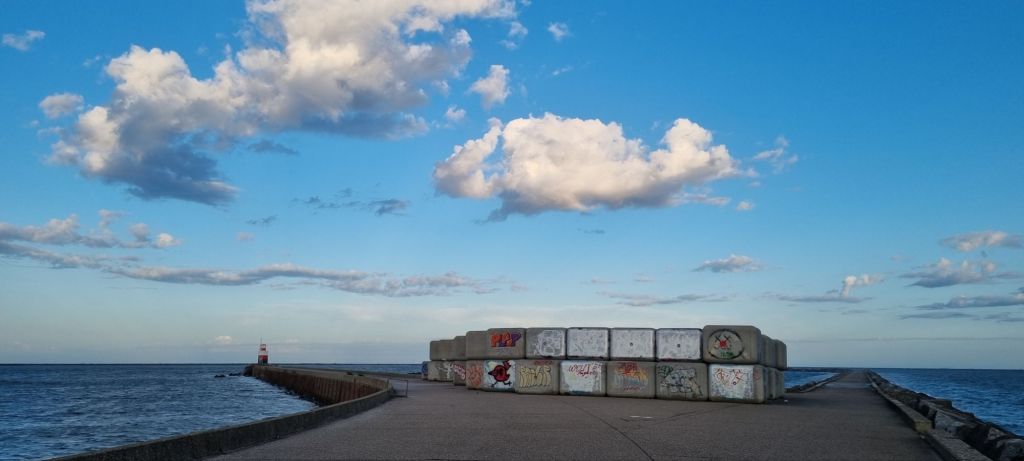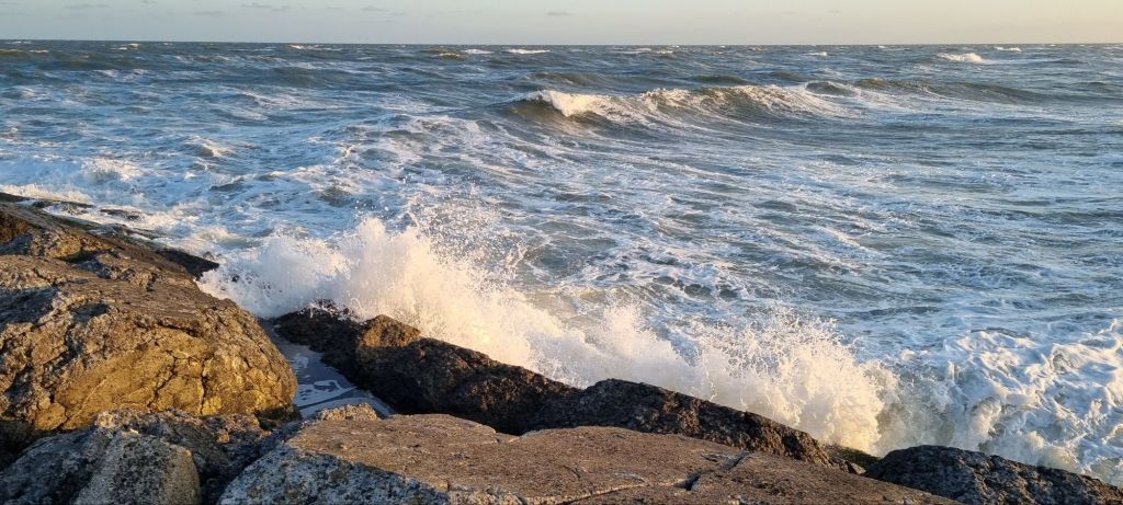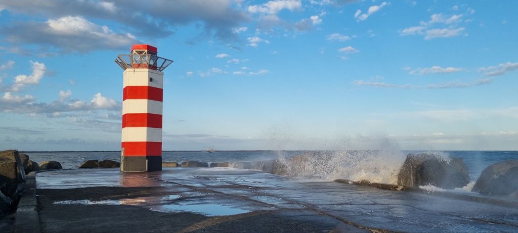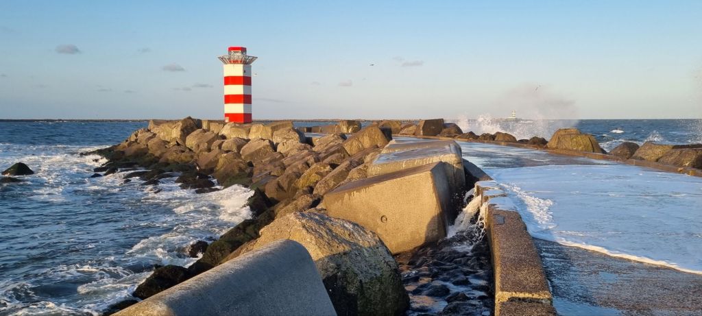 De wind staat op de kop van de pier dus daar slaan de golven goed overheen. Het einde is niet de bereiken zonder natte voeten. Verder is het allemaal goed te belopen.